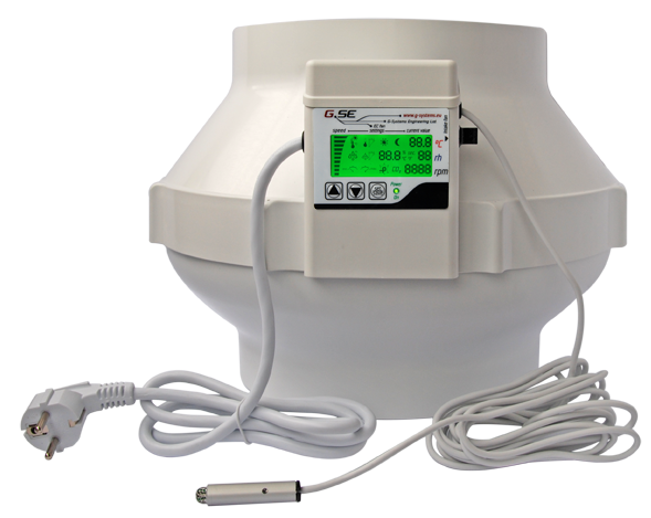 Der EC-Ventilator (Electronically commutated Motor, Bürstenloser Gleichstrommotor) hat einen Durchmesser von 250 mm, es ist ein sehr starker Ventilator mit 1'450 m3/h bei 0 [Pa]. Der EC-Lüfter hat die Eigenschaft, dass er bei niedriger Drehzahl kein Brummen macht und das geforderte Wirkungsgradgesetz von 2018 erfüllt. Ein eingebautes LCD-Display mit Tastatur und Power-LED ermöglicht ein sehr einfaches Einstellen und Ablesen aller vom Lüfter gegebenen Informationen wie z B. aktuelle Solldrehzahl, Temperatur, Luftfeuchtigkeit Tag/Nacht und Umdrehungen pro Minute des Motors. Ein separater Zuluftventilator kann an einen externen RJ45-Anschluss angeschlossen und mit reduzierter Geschwindigkeit betrieben werden, um während der Regelung einen Unterdruck zu erzeugen. Ein eingebauter Lichtsensor in der Sonde erkennt Tag/Nacht-Modi. Der Ventilator wird mit einem 1,5 m langen Stromkabel und einem 4 m langen Sensorkabel geliefert und ist sofort einsatzbereit. Mit nur drei Tasten können Sie 15 individuelle Einstellungen programmieren: