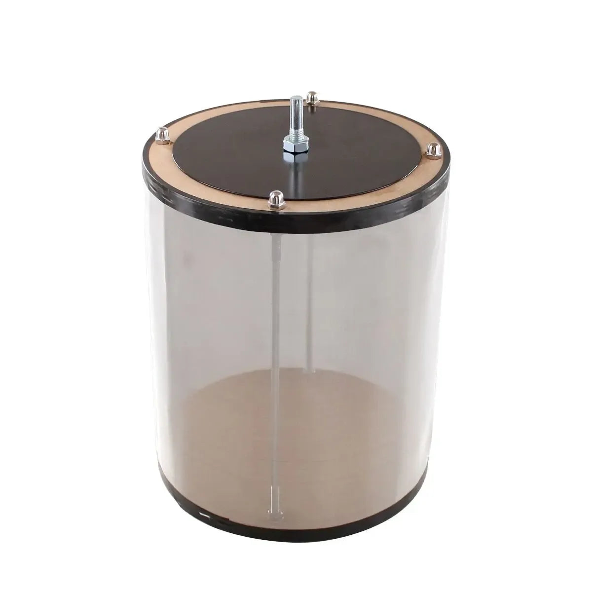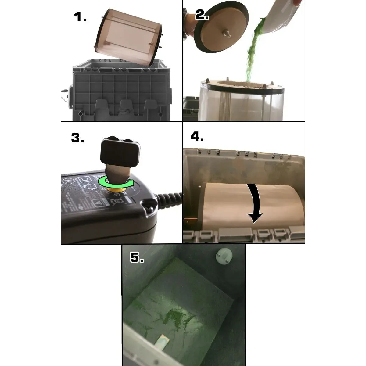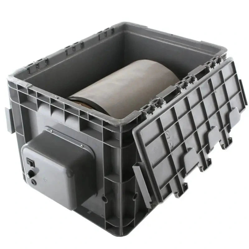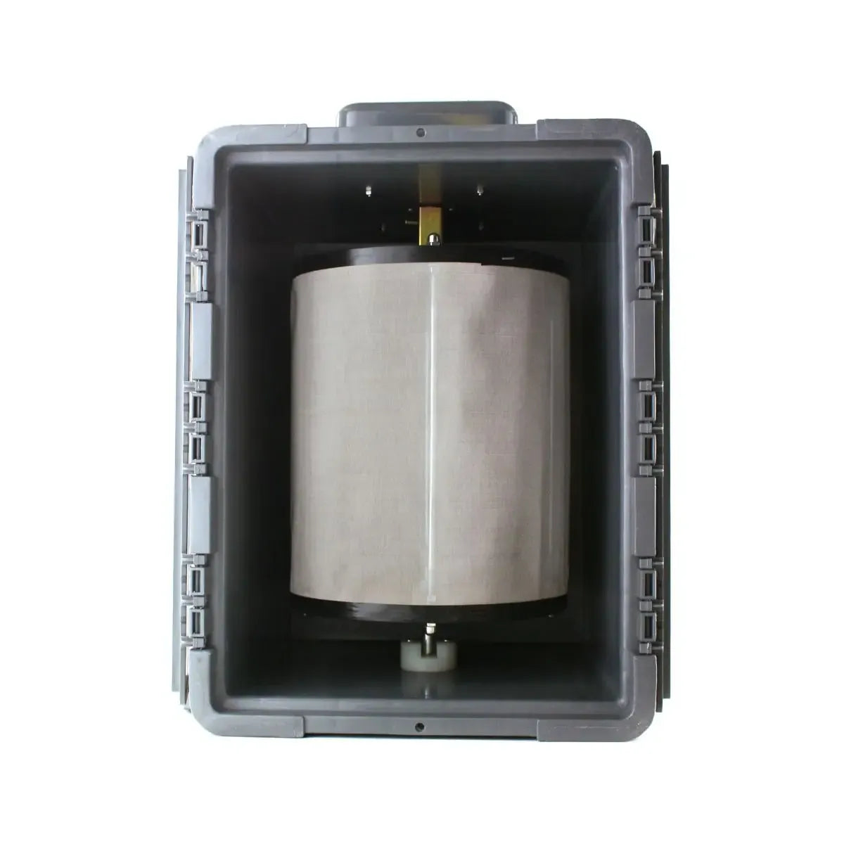 Die Box besteht aus PVC. Sie ist stabil und kann dicht verschlossen werden. Die elektrisch betriebene Siebtrommel läuft gleichmäßig und schleudert das Zielprodukt kontinuierlich aus. Die Siebtrommel ist ab Werk mit einem Stahlnetz der Maschengröße 150 µm bespannt.