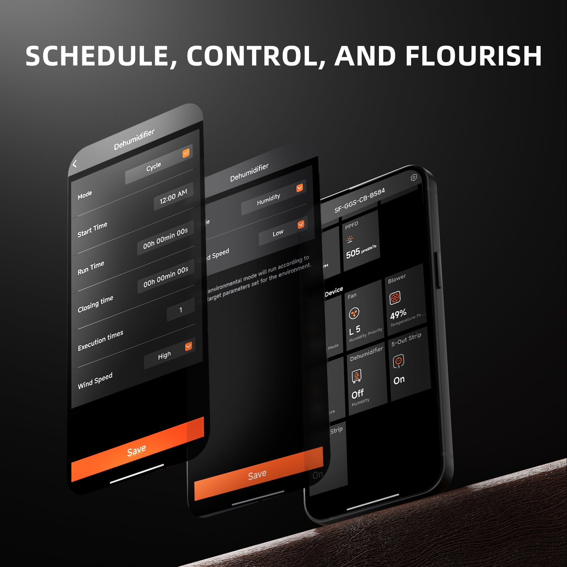 Der Luftentfeuchter wird über ein RJ12-Kabel mit der GGS Power Strip AC5/AC10 und dem GGS Controller verbunden und ermöglicht die Fernsteuerung über Bluetooth oder die Spider Farmer App. Integrieren Sie sich nahtlos in die Spider Farmer GGS-Serie für die intelligente Steuerung der Lüftergeschwindigkeit, Laufzeit und der automatischen Feuchtigkeitskontrolle.